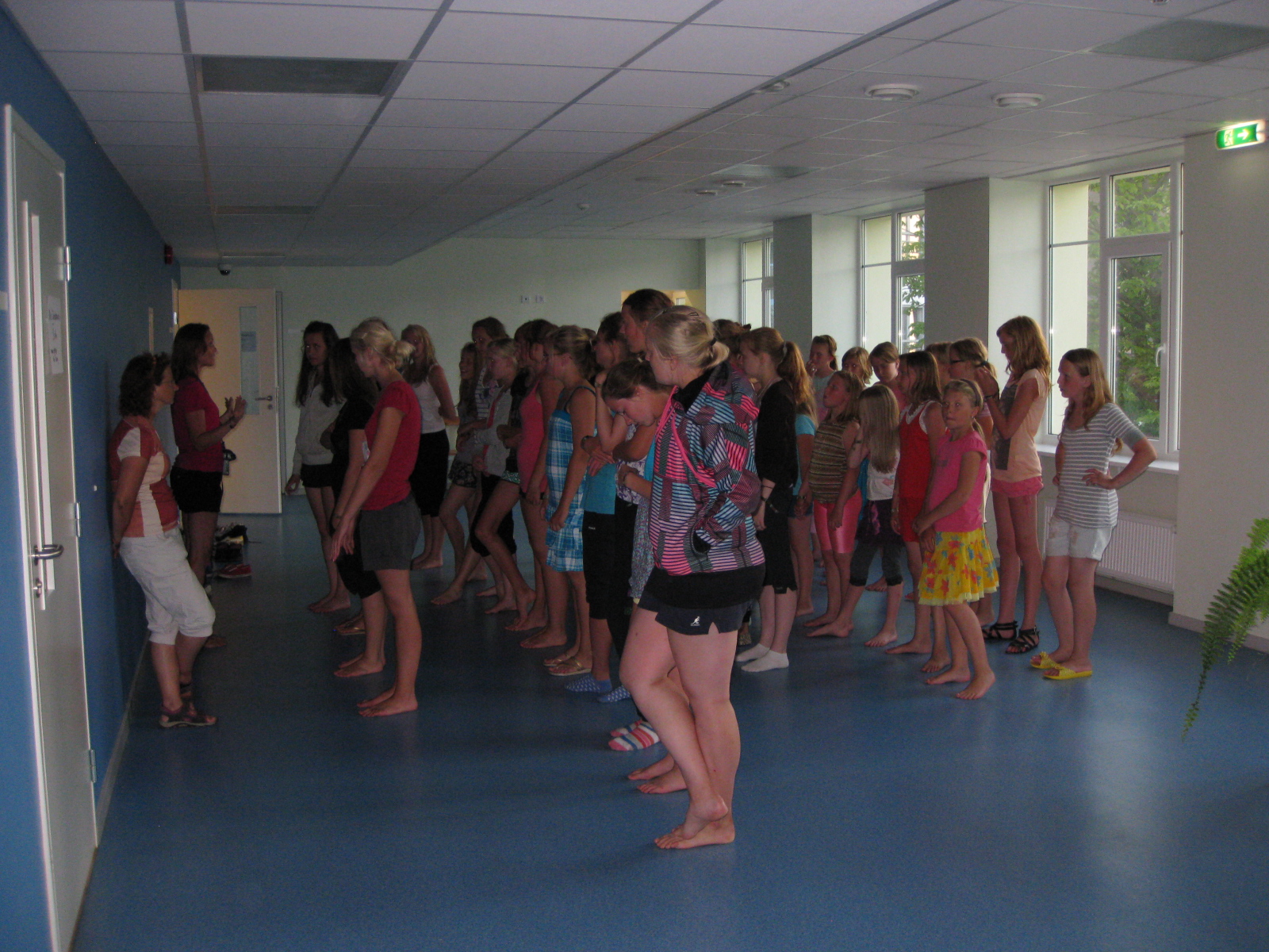8:45 algas juba väikeste võimlejate proov. Kõik sujus väga hästi. Mina rivistasin aga oma nurka üles ja lasin nad õigel ajal platsile. Kui tüdrukud olid oma kohad üle vaadanud, siis hiljem enam suurt muret polnud. Ühes kohas kippusid mõned korraks ära eksima, aga seegi sai korda.